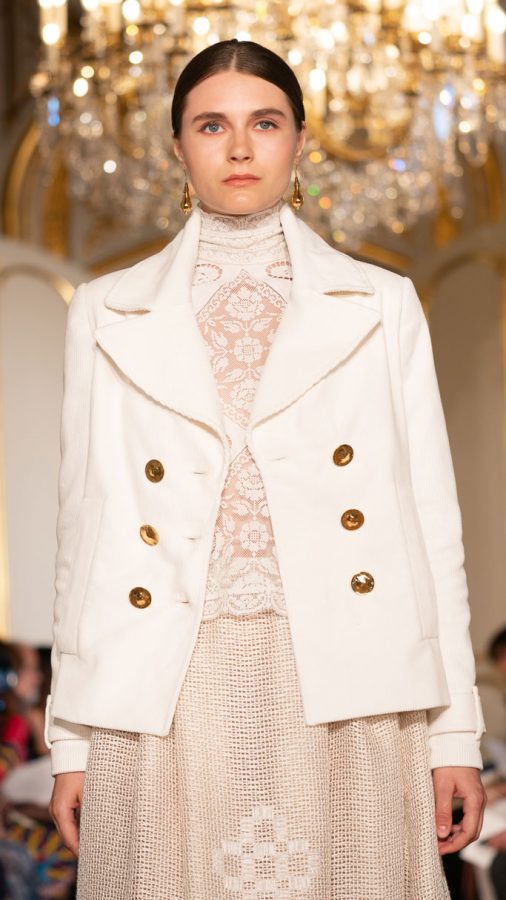 CABAN EN VELOURS BLANC À LARGES CÔTES BLOUSE ÉCRUE EN LIN, BRODERIE RICHELIEU JUPE PAYSANNE EN RÉSILLE DE LIN, BRODERIE DE HARDANGER EN LAINE