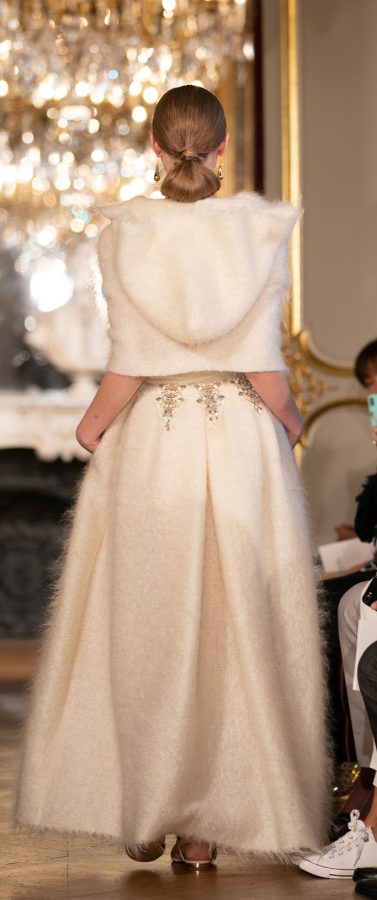 ROBE DE BERGER EN MOHAIR NATUREL, CEINTURÉE DE CLOUS BIJOUX.