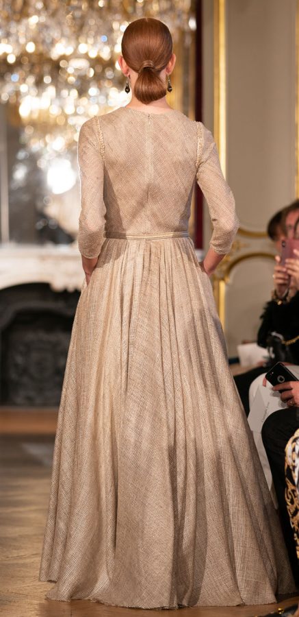 LONGUE ROBE CEINTURÉE EN RÉSILLE DE SOIE SEIGLE, PLASTRON BRODÉ DE TULLE ET ÉCLATS D’OR.